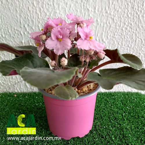 No podrás dejar de admirar sus pequeñas flores y sus hojas porpura, sol directo o resolana. 13x20 cms. Maceta de cerámica.